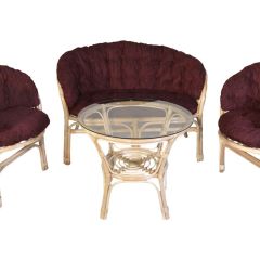 Комплект из натурального ротанга, состоящий из дивана, двух кресел и круглого столика со стеклом.